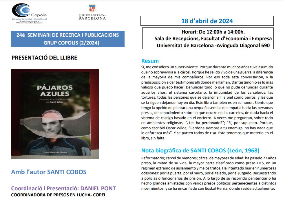El 18 d’abril 2024 se celebrarà el segon seminari de recerca del grup COPOLIS, coordinat per la catedràtica Elisabet Almeda. Presentarà el seu llibre “Pájaros Azules” Santi Cobos, supervivent de la presó i membre de la Coordinadora de Presos en Lucha – COPEL.