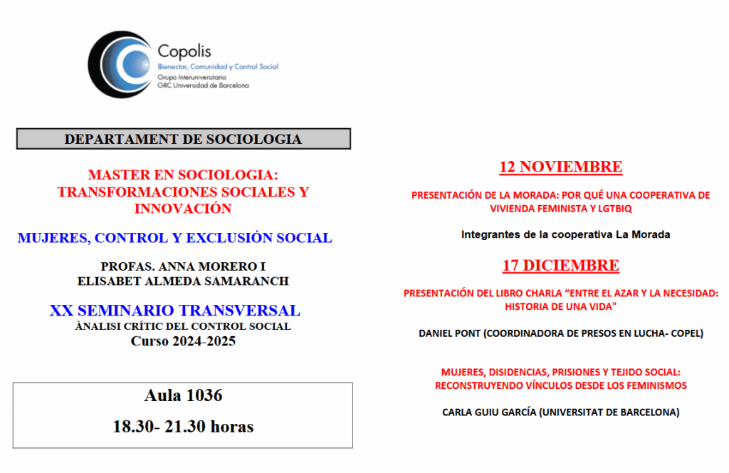 En el marc de l’assignatura Mujeres, Control y Exclusión social del Màster en Sociología: Transformaciones Sociales y Innovación, les membres de COPOLIS Elisabet Almeda Samaranch y Anna Morero Beltrán organitzen el XX Seminari transversal: Anàlisi Crític del Control Social. El seminari compta amb dues sessions: