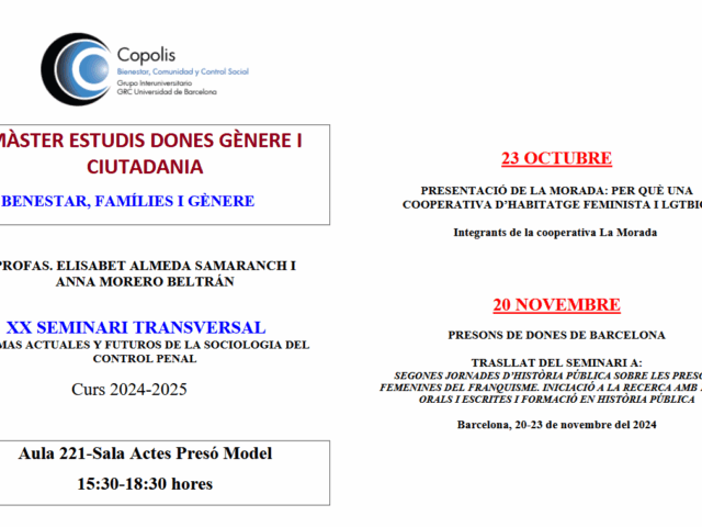 La catedràtica i fundadora de COPOLIS, Elisabet Almeda, ha estat recentment nomenada Coordinadora del Doctorat Interuniversitari en Estudis de Gènere: Cultures, Societats i Polítiques, un programa innovador que integra grups deContinue readingElisabet Almeda, nomenada Coordinadora del Programa Interuniversitari en Estudis de Gènere: Cultures, Societats i Polítiques